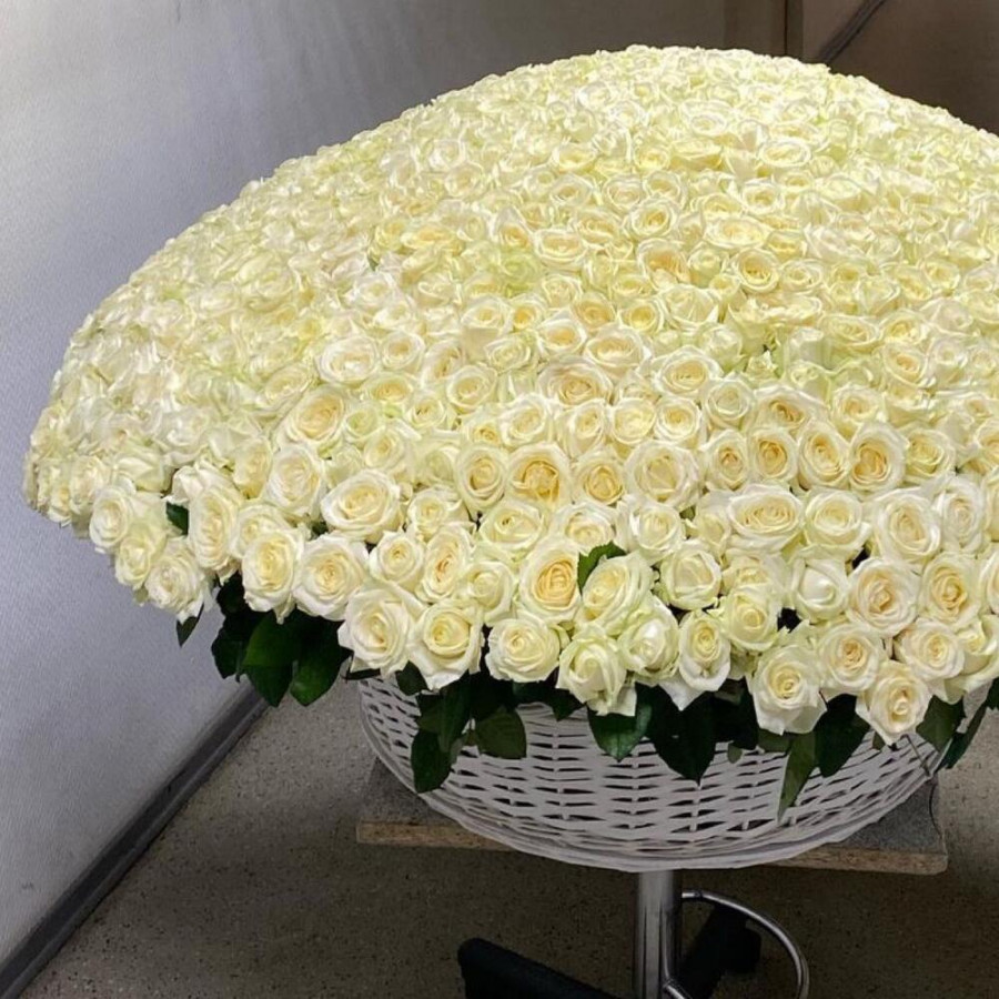 На фото 1001 белая роза в корзине «чистота». В составе: роза 1001 шт, корзина (xl) 1 шт, оазис флористический 27 шт, . Все цветы свежие и ароматные, букет красиво оформлен и отлично подходит для подарка. Доступна доставка цветов или самовывоз.