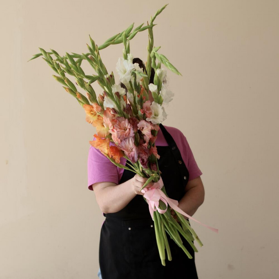 На фото букет из 11 разноцветных гладиолусов. В составе: гладиолус 11 шт, атласная лента 1 шт, . Все цветы свежие и ароматные, букет красиво оформлен и отлично подходит для подарка. Доступна доставка цветов или самовывоз.