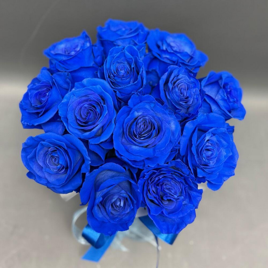 На фото 13 синих роз в шляпной коробке. В составе: роза (синяя) 13 шт, оазис флористический 1 шт, шляпная коробка (s) 1 шт, атласная лента 1 шт, . Все цветы свежие и ароматные, букет красиво оформлен и отлично подходит для подарка. Доступна доставка цветов или самовывоз.