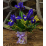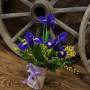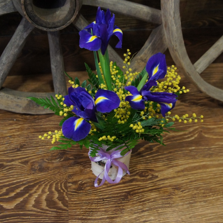 Подбираете необычный подарок для представительницы прекрасного пола? Обратите внимание на данную композицию. Ее оригинальное и небанальное исполнение гарантированно придется по душе самым романтичным и утонченным натурам. Цветы ириса, украшенные веточками мимозы и насыщенно зелеными листьями папоротника, помещенные в изысканное кашпо станут ярким дополнением любого праздника или торжества.