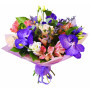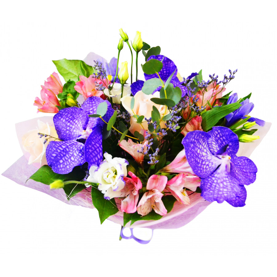 Красочный пестрый букет из ярких орхидей Ванда цвета индиго, крупных роз, веточек альстромерии, нежной эустомы с вкраплениями сухоцвета лаванды и свежей зелени эвкалипта будет идеальным сюрпризом для получательницы в пасмурный день и, несомненно, поднимет ей настроение своими яркими красками и волшебным ароматов цветов.