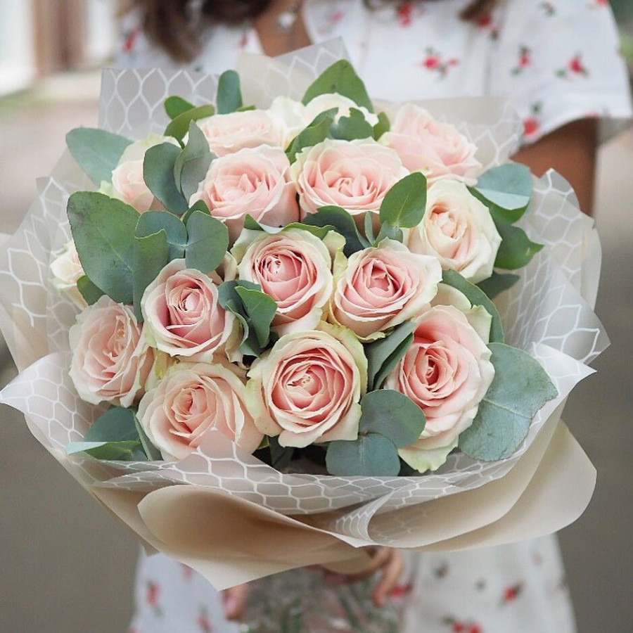 На фото букет из 15 бежевых роз. В составе: роза 15 шт, эвкалипт 2 шт, крафт-бумага 1 шт, атласная лента 1 шт, . Все цветы свежие и ароматные, букет красиво оформлен и отлично подходит для подарка. Доступна доставка цветов или самовывоз.