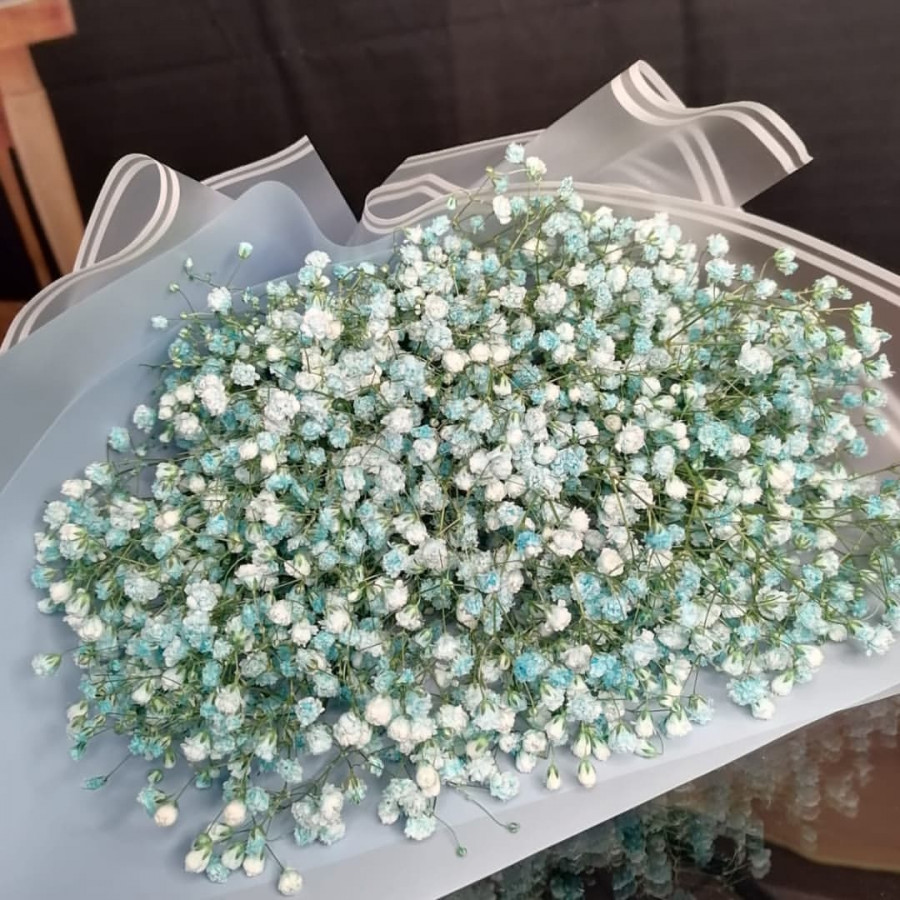 На фото букет из 3 голубых гипсофил. В составе: гипсофила 5 шт, крафт-бумага 1 шт, атласная лента 1 шт, . Все цветы свежие и ароматные, букет красиво оформлен и отлично подходит для подарка. Доступна доставка цветов или самовывоз.