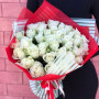 На фото букет из 43 белых роз. В составе: роза 41 шт, крафт-бумага 1 шт, атласная лента 1 шт, . Все цветы свежие и ароматные, букет красиво оформлен и отлично подходит для подарка. Доступна доставка цветов или самовывоз.