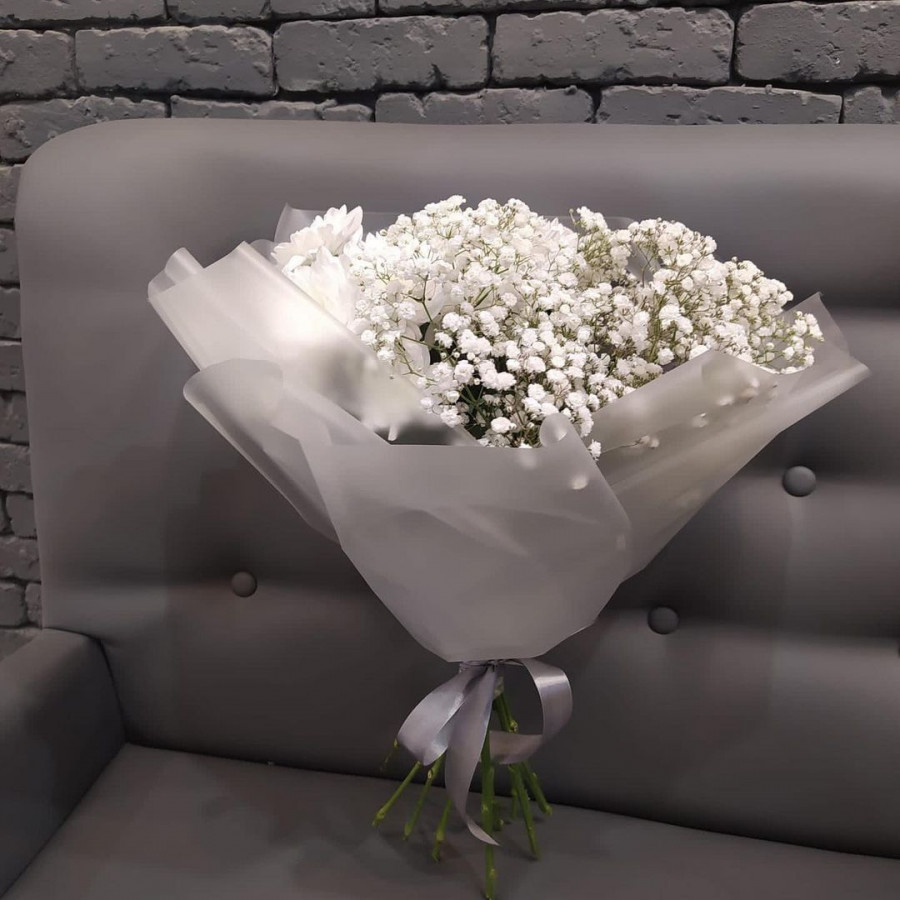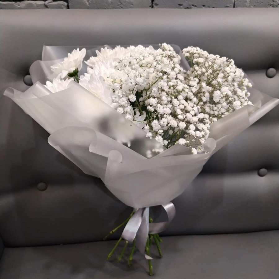 Букет из белой хризантемы и белой гипсофилы в Барнауле