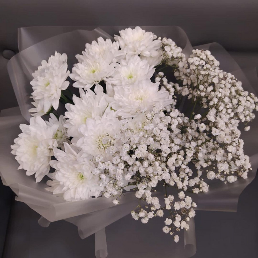 На фото букет из белой хризантемы и белой гипсофилы. В составе: хризантема кустовая 3 шт, гипсофила 2 шт, крафт-бумага 1 шт, атласная лента 1 шт, . Все цветы свежие и ароматные, букет красиво оформлен и отлично подходит для подарка. Доступна доставка цветов или самовывоз.