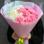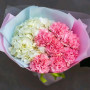 На фото букет из гортензии и гвоздик. В составе: гортензия 1 шт, гвоздика 7 шт, крафт-бумага 1 шт, атласная лента 1 шт, . Все цветы свежие и ароматные, букет красиво оформлен и отлично подходит для подарка. Доступна доставка цветов или самовывоз.