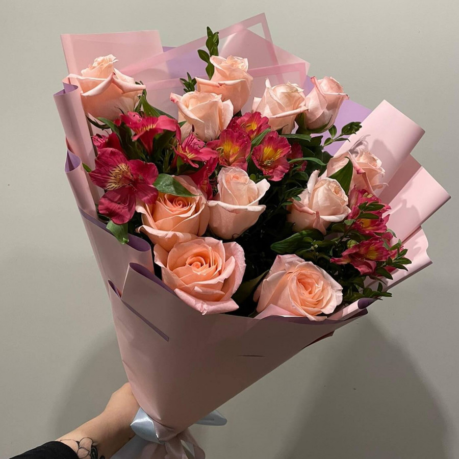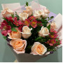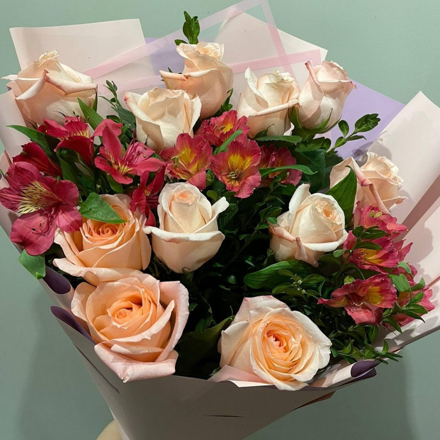 На фото букет из кремовых роз и альстромерий. В составе: роза 11 шт, альстромерия 4 шт, крафт-бумага 1 шт, атласная лента 1 шт, . Все цветы свежие и ароматные, букет красиво оформлен и отлично подходит для подарка. Доступна доставка цветов или самовывоз.