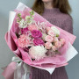 На фото букет из розовых роз и белых хризантем. В составе: роза 3 шт, кустовая роза 2 шт, хризантема одноголовая 2 шт, гвоздика 3 шт, маттиола 1 шт, крафт-бумага 1 шт, . Все цветы свежие и ароматные, букет красиво оформлен и отлично подходит для подарка. Доступна доставка цветов или самовывоз.