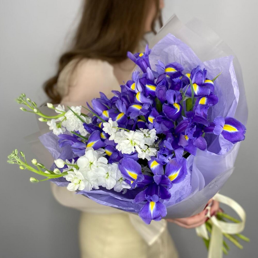 На фото букет из синих ирисов и белой маттиолы. В составе: ирис 15 шт, маттиола 3 шт, дизайнерская упаковка 2 шт, атласная лента 1 шт, . Все цветы свежие и ароматные, букет красиво оформлен и отлично подходит для подарка. Доступна доставка цветов или самовывоз.