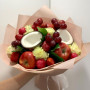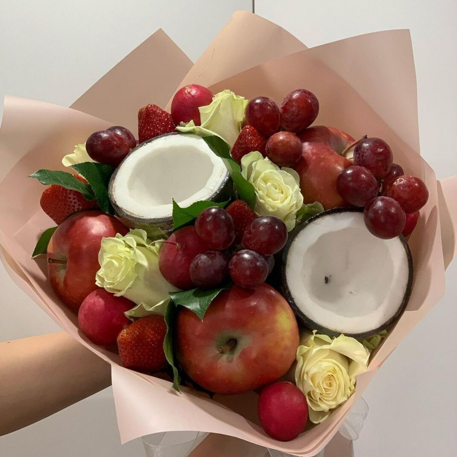 На фото букет из винограда яблок. В составе: виноград (розовый) 1 шт, яблоко 3 шт, роза 5 шт, клубника 10 шт, кокос 1 шт, крафт-бумага 1 шт, атласная лента 1 шт, . Все цветы свежие и ароматные, букет красиво оформлен и отлично подходит для подарка. Доступна доставка цветов или самовывоз.