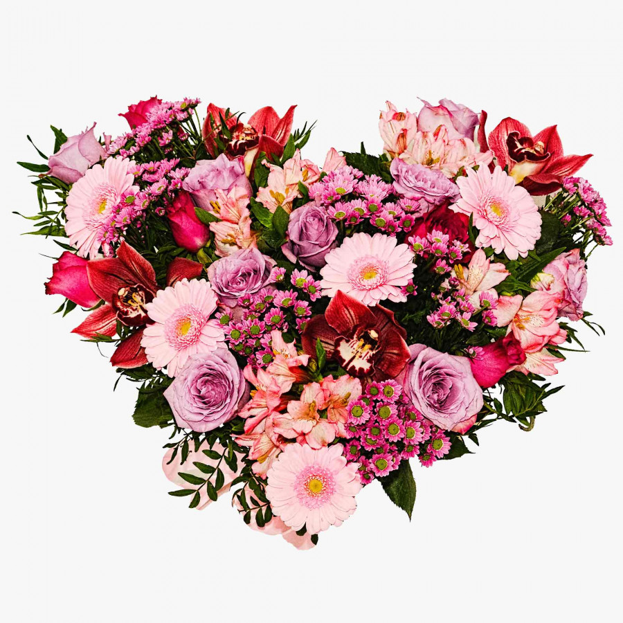 Рассказать о своих нежных чувствах любимой без слов можно с помощью самого настоящего сердца, собарнного из свежесрезанных бутонов роз, гербер, царственных орхидей, веточек хризантем и экзотической зелени. Признание любви с таким букетом станет оригинальным и надолго останется в памяти девушки. Кроме того, это замечательный подарок на свадьбу.
