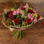Композиция состоит из пяти свежайших роз, трех хризантем, веточек альстромерии, насыщенно зеленых листочков папоротника и питтоспорума, несет в себе максимум свежести, позитива и радости. Это отличный самостоятельный подарок, превосходный знак внимания или проявления теплых чувств. Элегантная упаковка и невероятный аромат обязательно будут по достоинству оценены получателем данного букета.