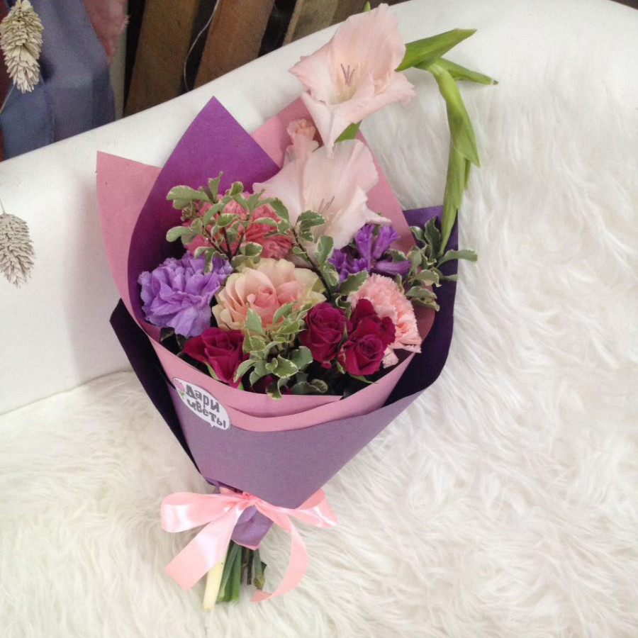 Небольшой букет с интересным сочетанием оттенков и цветов покорит сердце красавицы своими изящными кустовыми розочками, волнистыми лепестками гвоздики, цветком гладиолуса и ароматом весеннего ветра. Нежные оттенки и интересная упаковка придутся по вкусу изысканным избранницам.