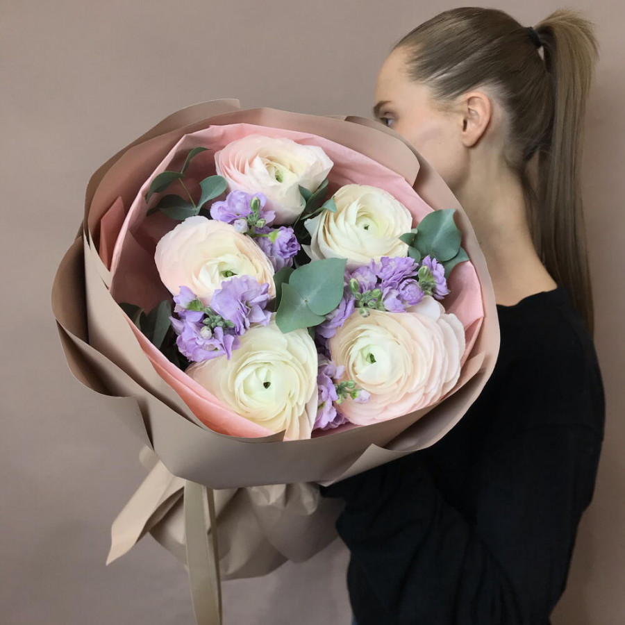 Букет из розовых ранункулюсов и сиреневой матиолы в Барнауле