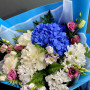 На фото букет с синией гортензией и другими цветами. В составе: гортензия 1 шт, роза 3 шт, хризантема кустовая 3 шт, эустома (лизиантус) 2 шт, папоротник 2 шт, крафт-бумага 1 шт, . Все цветы свежие и ароматные, букет красиво оформлен и отлично подходит для подарка. Доступна доставка цветов или самовывоз.
