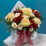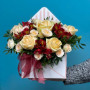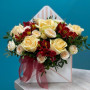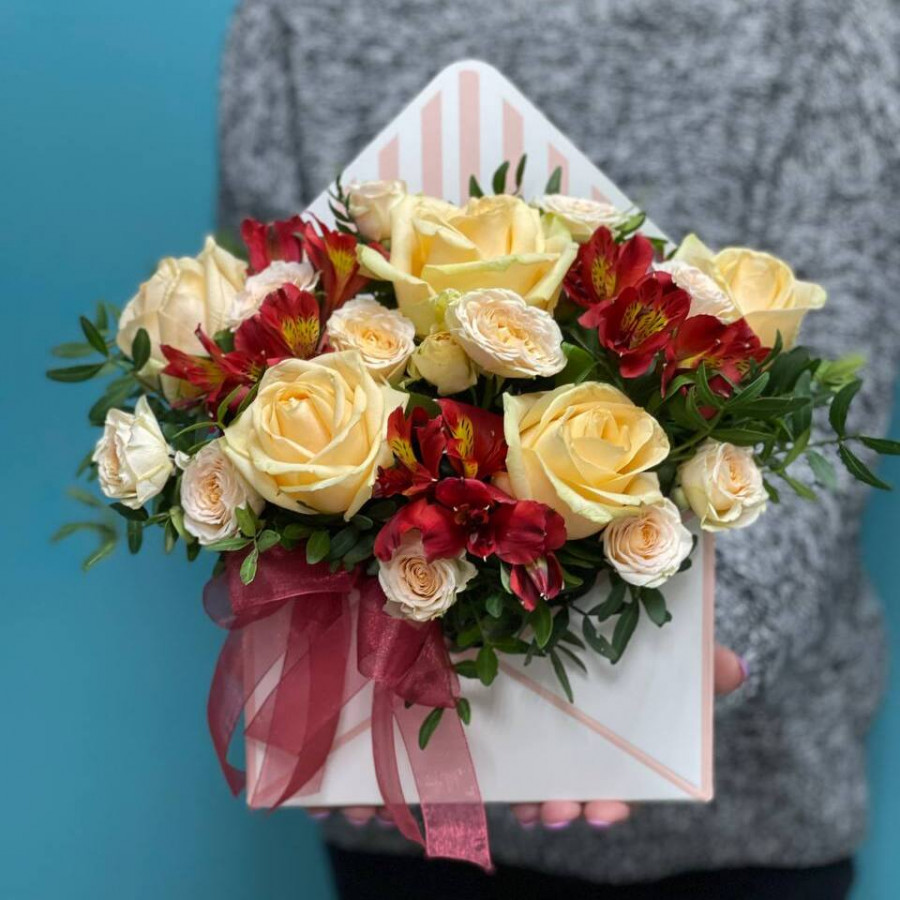 На фото композиция из кустовых роз в коробке. В составе: роза 4 шт, кустовая роза 3 шт, альстромерия 3 шт, писташ 2 шт, конверт 1 шт, . Все цветы свежие и ароматные, букет красиво оформлен и отлично подходит для подарка. Доступна доставка цветов или самовывоз.