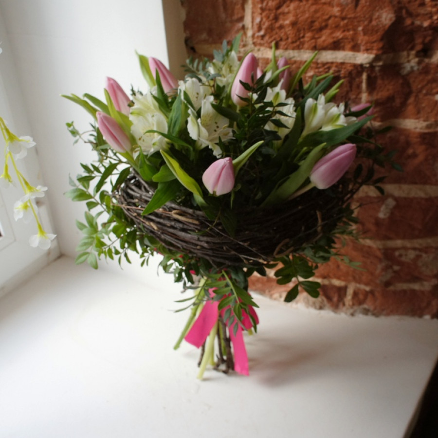 Невероятно утонченные, изысканные веточки альстромерии, которые так гармонируют с девятью свежесрезанными яркими тюльпанами и декоративным писташем, гарантированно покорят сердце каждой представительницы прекрасного пола. Легкий, но крепкий каркас и стильная лента дополняют общий привлекательный внешний вид букета, обеспечивая отличную стойкость всей композиции и увеличенный срок хранения.