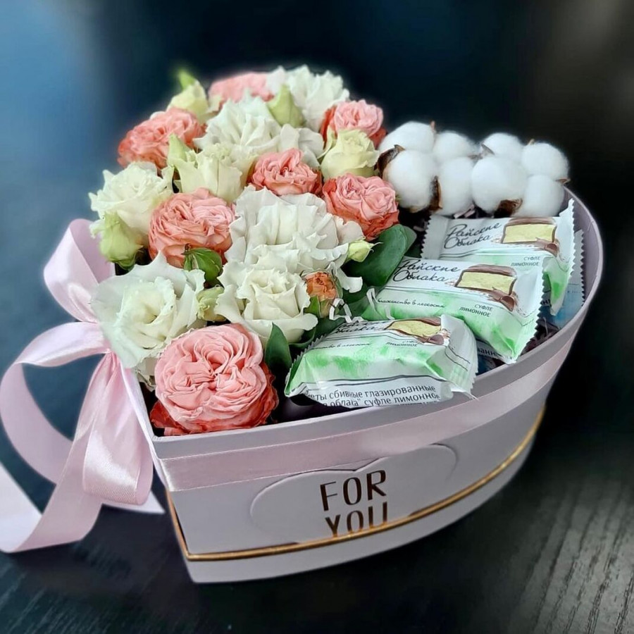 На фото коробка сердце с конфетами. В составе: кустовая пионовидная роза 2 шт, конфета 3 шт, эустома (лизиантус) 1 шт, хлопок 2 шт, коробка (s) 1 шт, . Все цветы свежие и ароматные, букет красиво оформлен и отлично подходит для подарка. Доступна доставка цветов или самовывоз.